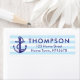 En nautisk tematisk marin blå namn och en returadressetikett med ankare och rep bredvid din familj namn och adress på en blek blå stripe-bakgrund.