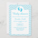Detta stilrena blå baby shower -inbjudningskort har söta silhuetter av bebisfötter i blå färg. Bakgrundsfärgen är mjuk blå med ett ljust sicksackmönster.