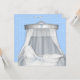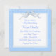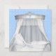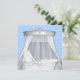 Vacker vit spetsflätad vagga med elegant silvervit baldakin. Elegant blå ögla-band och blå spetsbakgrund med vintage vit flätad vagga med blå rosett. Lägg till dina detaljer på framsidan och baksidan genom att lägga till evenemangsinformation, teckensnitt, teckenstorlek och färg samt formulering. Observera att alla inbjudningsdesigner du hittar på Zazzle är tryckta bilder på vanligt papper utan faktiska ädelstenar, rosetter, upphöjda eller präglade delar eller detaljer.