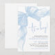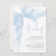 Det är en pojke! Inbjudan till baby shower. Denna söta och lekfulla design har en mjuk, dammig blå akvarellbåge med ett bandram som accentuerar toppen och vänster sida, vilket ger en charmig och fantasifull touch. Frasen "Det är en pojke!" visas högst upp i elegant skrivstil, vilket sätter tonen för en glädjefylld firande.