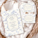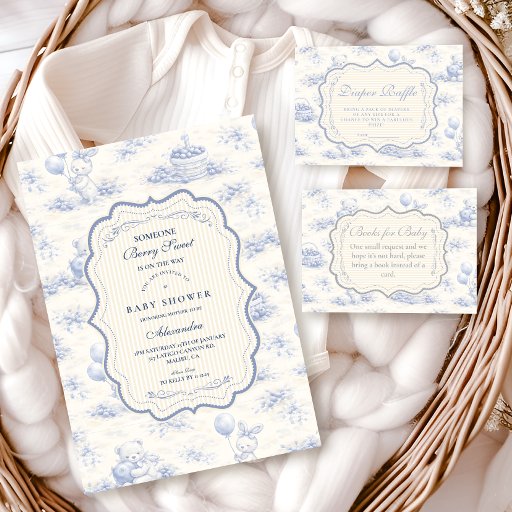 En söt design inspirerad av vintage med ömtåliga blå band, mjuk randig detaljering och charmiga blåbärsillustrationer. Toile-mönstrad konst med söta djur och fruktkorgar ger en klassisk sagobokskänsla i en mjuk pudrig blå färgskala. Den utsirade centrala ramen tillför elegans samtidigt som den håller det övergripande uttrycket lätt, raffinerat och tidlöst. Perfekt för en baby shower med ett mjukt trädgårdstema och en touch av traditionell charm.