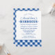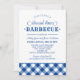 Samla bröllopspartiet med denna kräsna och klassiska bröllopsrepetitionsbarbecue-inbjudan i djupblått. Blandad script- och västerninspirerad "Barbecue"-typografi kombineras med en blå gingham-kant för en prickig, polerad tolkning av en avslappnad fest. Alla namn, datum och detaljer är helt redigerbara. Perfekt för en bakgårds- eller utomhusbröllopsrepetition-barbecue.