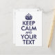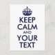 Det mörk blått anpassadet "Behålla Lugn och Din text"-design. Redigera texten om du vill skapa ett eget vykort med ett anpassningsbar-textmeddelande. Om du behöver ett mindre teckensnitt under en längre ord föreslår vi att du markerar hela designen innan du minskar storleka. Du kan också ändra den vita bakgrunden färg.