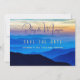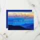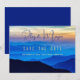Kort i berget bröllop spara datum med blå bergskorgsbild. Anpassa med modern, snurrande text för första namn av paret överst på kortet mörk blått över ett solnedgång/himlar. Om fullt inte är kort kommer bara det första namn att rymma. "Spara datumet"-texten i mitten över vibranta blå berg och datum och plats för händelsen i mindre text under. Omvänd är solid mörk blått. Uppgradera pappra som du vill.