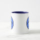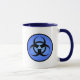 Svart biofarosymbol på en blå cirkulär bakgrund. Gör en djup påstående om kaffet. Val av keramik, glas eller resemugg av rostfritt stål.