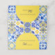 Den här strålande designen har en bakgrund mönster av blå, gult och vit vattenfärg portugisiska plattor eller azulejos. Utrymmen för bordsnummer och gästernas namn tillhandahålls av blått linjer på en gult som är bågformad, med ord "Bord" i blått kalligrafiskt skript. Insidan av korten är helblå.