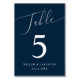 Minimal och elegant bröllop-bordsnummer med modern manustext som säger "Bord" överst på marinblå bakgrund.