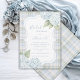 Vacker blå akvarell fin framtoning som omger vackra stilar och skript utförda i samordnade färger bröllopsfest inbjudan. En blå, vit och grön söt samordnad randig bakgrund. Stora blå hortensior gjorda i mjuka akvareller. En perfekt bröllopsfest inbjudan för alla säsonger.