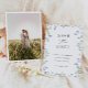 Meddela din speciella dag med stil med detta sofistikerade "Spara Datum"-kort med en vacker illustrerad blå blommig ram. Designen kombinerar en tidlös blå färgpalett med modern typografi och skapar en lyxig och romantisk känsla. Lägg till ditt foto på baksidan.