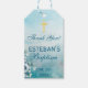 Säg tack med denna lugna och eleganta religiösa presentetikett. Den har en dimmig akvarellberggrund utsmyckad med ömtåliga dammiga blå rosor