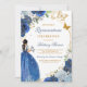 Fira en speciell milstolpe med denna eleganta Quinceanera-inbjudan som visar en ung flicka i en flödande blå klänning omgiven av gyllene fjärilar och blå blommiga accenter. Den marmorerade bakgrunden och glänsande gyllene detaljer skapar en lyxig design perfekt för att hedra detta oförglömliga tillfälle. Personliggör med evenemangsinformation för att göra det unikt för dig.