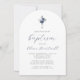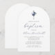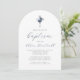 Denna eleganta bågformade dopinbjudan har en akvarellbukett av dammig blå och marinblå blommor och silverblad på ett silverfärgat falskt foliekors, ovanför orden "vänligen gå med oss på dopet av vår son" i elegant marinblå handskriven kalligrafi och kolgrå kursiv stil. Personalisera den med namnet i blå script och detaljerna i grå sans serif-teckensnitt.