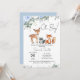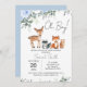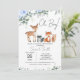 Söt skogsbarnskasinbjudan för en babypojke med fyra söta skogsdjur. Denna skogstematiserade barnkalasinbjudan har också några blad och några blå rosor. Denna inbjudan är idealisk för en pojkes skogstematiserade barnkalas för en babypojke.