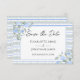 Vackra handritade blå vattenfärg blommor med flödande grönska av vinrankor och blad som skapar ett vackert bakgrundsrandmönster för detta underbara Save the Date påminnelse bröllopskort. Koordinerande mönster på baksidan.