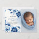 Blå blommigt Chinoiserie och vattenfärg tvättar pojkens Baptism-fotoinbjudan. Inbjudan är förtrollad med en kinesisk porcelinaininspirerad blommigt. Vackra blommor som framställs i stil i den traditionella bläck-målningen, kaskad med grym fluiditet. En palett med rik blues dominerar - den djupa koboltallen, det själsliga djupet av indigo, som punkteras med skarpa vita högdagrar som fångar ljuset. Den här eleganten utformar ramar i hörnen av inbjudan och skapar en visuell harmoni som lämnar utrymme för att informationen om personlig bröllop ska visas på ett bra sätt. Det finns också ett foto av baby och en blå vattenfärg som tvättar. Baksidan har ett blommönster.