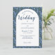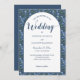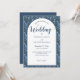 I inbjudan till personligt bröllp visas illustrationer av ljusblå delfinblommor som ställs in mot en marin blå bakgrund. Den vita bågformen eller bågformen i mitten är redot att vara personlig med alla dina detaljer när det gäller att samordna marinblå bokstäver.