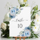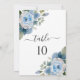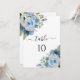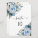 Vackert blått och vitt bordsnummer-kort för blommigt bröllop.