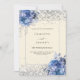 En gräddbakgrund som dekoreras med blå ro, blommor och faux silver konetti. Anpassa och lägg till information om namn och bröllop. Black brev.