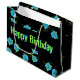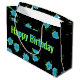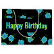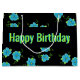 Blått, grönt och svart, formgivare blomstrade grattis på födelsedagen-presentsäck. Text kan vara personlig till kostym vid särskilda tillfällen. Text kan också tas bort. Den svarta bakgrunden kan ändras till färg och om du föredrar att även det svarta bandet kan tas bort.