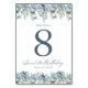Dusty blåa blommor skapar överst och grund gräns på det här elegant bordsnummer-kortet. Klassisk manusgrafi tillför en vacker beröring. Det här objektet är party i samlingen Dusty Blue blommigt