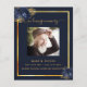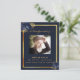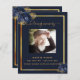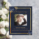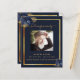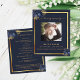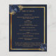 Ett tvåsidigt program för elegant. En mörk blått bakgrund, en faux guld ram, blå blommigtar och ett fotomatutrymme. Anpassa och lägg till namn, data och din text.