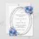 För ett vinterbröllop. En vit bakgrund som dekoreras med blå blommigtar, ro. En faux silver tittar ram. Anpassa och lägg till namn och information. 1 lakan = 1 inbjudan tryckt kant till kant.