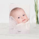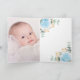 Vit bakgrund. Ljusblå blommor, rosor och eukalyptusgrönska. Tack är skrivet med en stor handskriven typsnitt. Insidan: Ett stort foto och utrymme för din handskrift. Baksida: ett andra foto.
