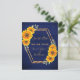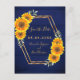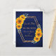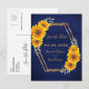 En rustik land stil sparar datumkortet. Ett faux guld ram med gult och orange solblommor. Anpassa och lägga till namn och datum för bröllop. En mörk marin, blå, rustik läggvägg som bakgrund. Golden brev. Namn är skrivet med ett modernt handskript i stil. Tillbaka: namn, datum, ställe i bröllop. Ingen bakgrund färg.
