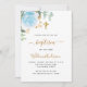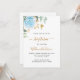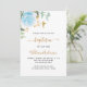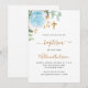 En vit bakgrund dekorerad med eukalyptusgrönska, en ljusblå ros och gyllene blad. Personifiera och barnets namn och ceremonidetaljer. Svarta och gyllene bokstäver.