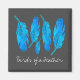 Vacker blå boho-fjäderdesign med blå akvarellfjädrar mot en mörkgrå bakgrund. Vacker djupblå design med en boho-känsla. Fåglar av samma fjäder-förslag
