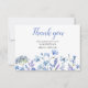 Blått blommigt bröllopsdusch platt tackkort. Elegant akvarell vildblomsdesign. Lätt att ändra texten.