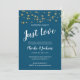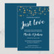 Denna fantastiska blå bröllopsinbjudan är det perfekta sättet att inbjuda dina vänner och familj till en mottagning! Designen har en mörkblå bakgrund, söta ljuslyktor och vit text i handskriven och blockfont. Bjud in dina vänner och familj till en rolig kväll!