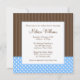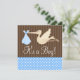 En söt blå och brun pojke bebis inbjudan. Med en stork som bär en blå bunt. Trendigt och modernt -- Personalisera enkelt för din bebisfest!