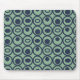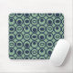 Den här musknappen har en geometrisk utformning av cirklar i rader med cirklar eller ovaler i blått på fält i grönten.
