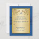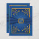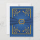Detta kungliga blå damaskus med guld blommig svarskort har ett falskt band och guld medaljong på sig som matchar bröllopsinbjudan nedan.