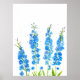 Blå delphinium-blommor vattenfärg av den amerikanska konstnären Monika Howarth. Handmålade teckningar. Blåa blommor-design. Chicens hemdekanter. Perfekt för henne.