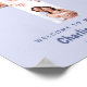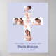 Ett korsformat fotokollage av 5 familjebilder på en baby med och utan föräldrarna. Bakgrunden är ljusblå, texten under korscollaget är mörkblå.