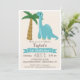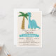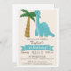 Blå dino och handflatan träd, förhistorisk dinosauritema neutralt, pojke eller flicka födelsedagsfest inbjudan. Känn inbjudan med ditt barns namn. Ljusare, enkel, enkel design. Perfekt för baby först, 1:a, födelsedag, småbarn, små barn eller äldre barn. Färg omfattar grönt, vattenblått och brunt.