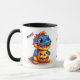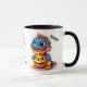 Här är ett sött Halloween mugg-för barn som är mer roligt än läskigt och som lätt kan anpassas efter ett barnbarn, en son eller en dotter. En ljusblå dinosaurie med orange jack o'lantern roars på två sidor av mugg, med svart text i mitten som du kan anpassa för ditt eget hälsning. Särskilt lämpligt för små barn.
