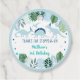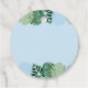 Dessa vackra märkre för babydusch har blå dinosaurier med tropiska vattenfärgsfärgade löv.