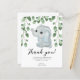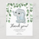 En riktigt söt och bedårande akvarell av en liten elefantpojke omgiven av eucalyptusblad. Det här tackkortet är tryckt på papper och är det perfekta sättet att tacka dina vänner och familj för att de kom till din babyfest och 'öste' kärlek över dig. Det här tackkortet för babyfirande kan göras personligt med inkluderingen av ditt eget tackmeddelande och namn eller så är du välkommen att behålla designtexten som den är och bara inkludera ditt/dina namn.
