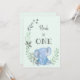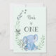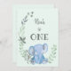 Blå Elefant med Blommig Design Första Födelsedagsinbjudan med anpassningsbar bakgrundsfärg och text.