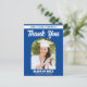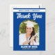 Denna moderna blå anpassade senior-examens tack-kort har klassisk vit typografi med ditt universitetsnamn för klassen 2025 och ditt seniorfoto under en trendig båge. Anpassa med ditt examensår under den chic handskrivna stilen nedanför ditt fotografi.