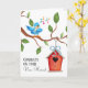 Skicka ett gratulationskort till din favorit ny husägare! Detta bedårande kort har en blå lyckofågel på framsidan som sjunger från toppen av en trädgren med ett trädkoja som hänger nedanför. Texten på insidan är lätt att uppdatera för din egen personliga hälsning eller använd vår.