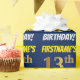 Denna design för inslagningspapper har ett meddelande som "FÖRNAMN:S 13-ÅRSDAG!", där "13" har en falsk/imiterad guldliknande färgton, och med namnet och "FÖDELSEDAG" i ett roligt, fet stil. Namnet kan anpassas, och bakgrunden är blå. Inslagningspapper som detta kan kanske användas när man slår in födelsedagspresent åt någon för att fira deras trettonårsdag. [~Z0000209]