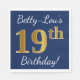 Den här enkla pappra napkin-designen innehåller ett meddelande som "Betty-Lous 19:e födelsedag!", där "19:e" har ett faux-guld-liknande utseende på blå färgad. Namn kan vara personlig. Den skulle kunna användas i en födelsedagsfest till någon som firar sin nittonårsdag. [~Z0000083]