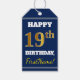 Den här märkrn med födelsedagspresent innehåller ett meddelande som "LYCKLIG 19:e BIRTHDAY, FirstName!", där namn kan vara personlig och där siffran "19:e" har ett utseende som liknar guld/imitation färg. På framsidan finns också en blå färgad. Baksidan har en Från:-linje. Märkre av födelsedagspresent som dessa skulle kanske kunna användas på gåvor som ges till någons nittonårsdag. [~Z0000215]