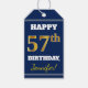 Den här märkrn med födelsedagspresent innehåller ett meddelande som "LYCKLIG 57:e BIRTHDAY, Jennifer!", där namn kan vara personlig och där siffran "57:e" har ett utseende som liknar guld/imitation färg. På framsidan finns också en blå färgad. Baksidan har en Från:-linje. Märkre av födelsedagspresent som dessa skulle kanske kunna användas för gåvor som ges till någons femtiosjunde födelsedag. [~Z0000215]