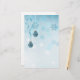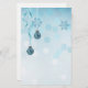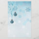 Julillustration i blått: Blåa glitter-dekorationer med böjda rosett band på en vit-blå baksida.
