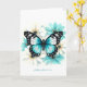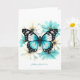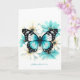 En vacker detaljerad blå fjäril vilar bland mjuka akva och vita akvarellblommor på detta eleganta naturinspirerade vykort. Perfekt för födelsedagar, tack eller uppmuntrande meddelanden.